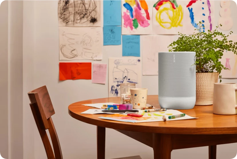 Когда потребуется зарядить устройство, установите его на удобную беспроводную зарядную базу, которая идёт в комплекте. Добавьте другие колонки Sonos в разных комнатах, чтобы создать единую систему прослушивания по всему дому.